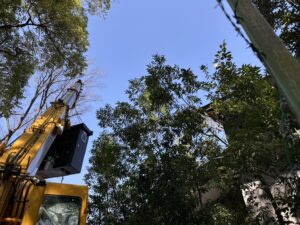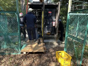 樹木に囲まれた狭小な敷地での作業となり、クレーンを使用して新しいキュービクルを慎重に搬入・据え付けました。